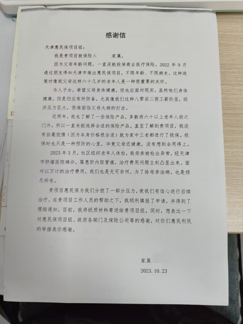 近期,“天津惠民保”理赔中心就收到了一封由家属宋女士寄来的感谢信,信中宋女士讲述了为父母投保“天津惠民保”到发生理赔的心路历程,让很多人感受颇深。